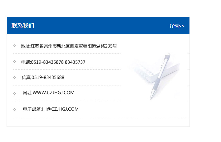 地址:常州市新北區友邦商務大廈1幢16、17層  電話:0519-85101652  傳真:0519-85112595  郵編:213022  網址:www.cz-jiayue_cn.dmyygd.com  郵箱:xiajifengaa@163.com